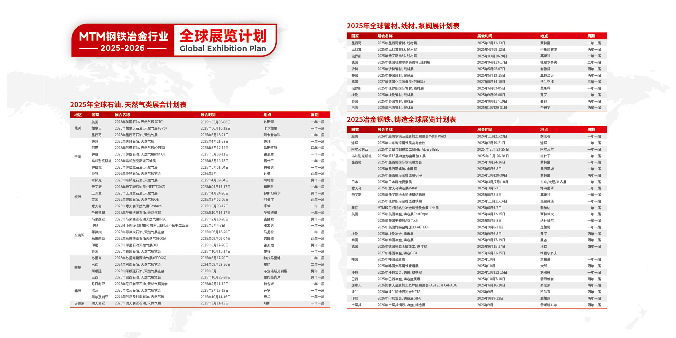 MTM金属世界博览会源自创办于1986年的上海国际冶金工业展览会。经过30多年的发展,形成了冶金展、耐火材料展、铸锻造展、钢管工业展、金属线材展、工业炉热工展、有色金属展七大主题展的钢铁冶金全产业链一站式采购平台。2025年,MTM金属世界博览会将以“科技创新、绿色低碳、智能制造、高效集约” 为主题,聚焦未来钢铁产业发展变革之路,分享行业技术创新成果与实践。为全产业链可持续发展增添动力。